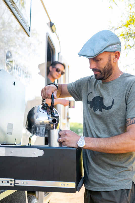 Le véhicule est bien équipé pour le camping : il comprend un réfrigérateur/congélateur de 40 L, une cuisinière à gaz (avec deux foyers – un intérieur et un extérieur) alimentée par une bouteille de gaz de 3 kg, un réservoir d’eau de 60 L, une douche extérieure à main et des installations pour l’eau chaude.