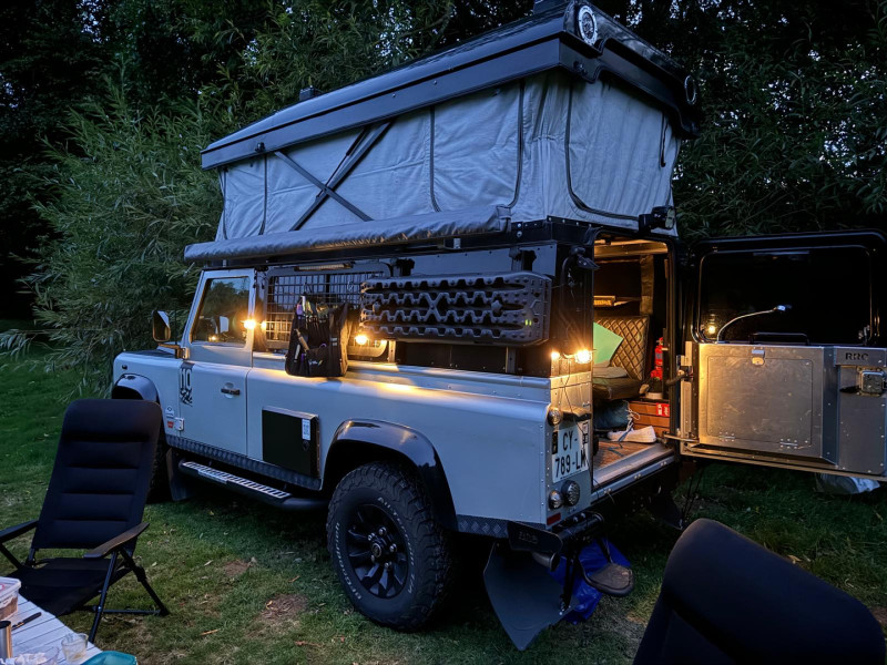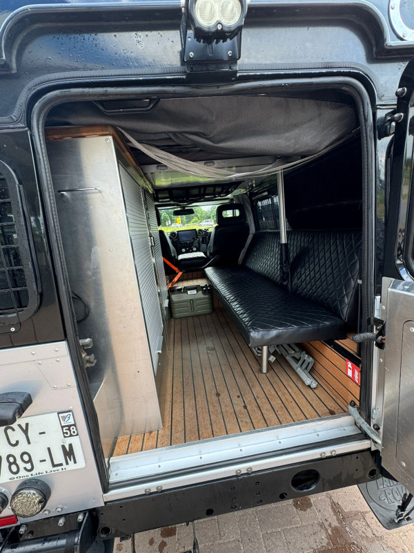 Ce Defender a été entièrement aménagé avec ce qui se fait de mieux en termes d’équipement, offrant une expérience de voyage unique pour les aventuriers recherchant confort et performance.