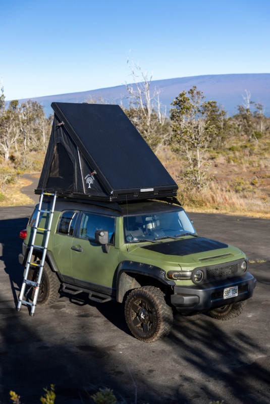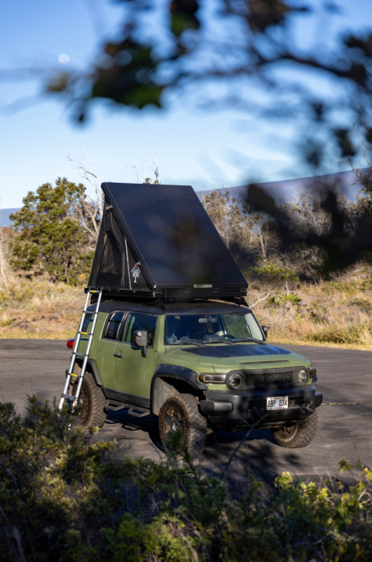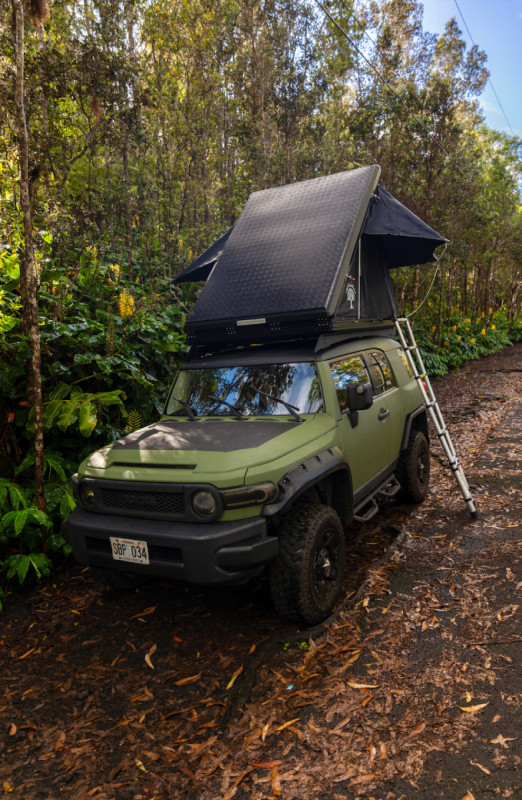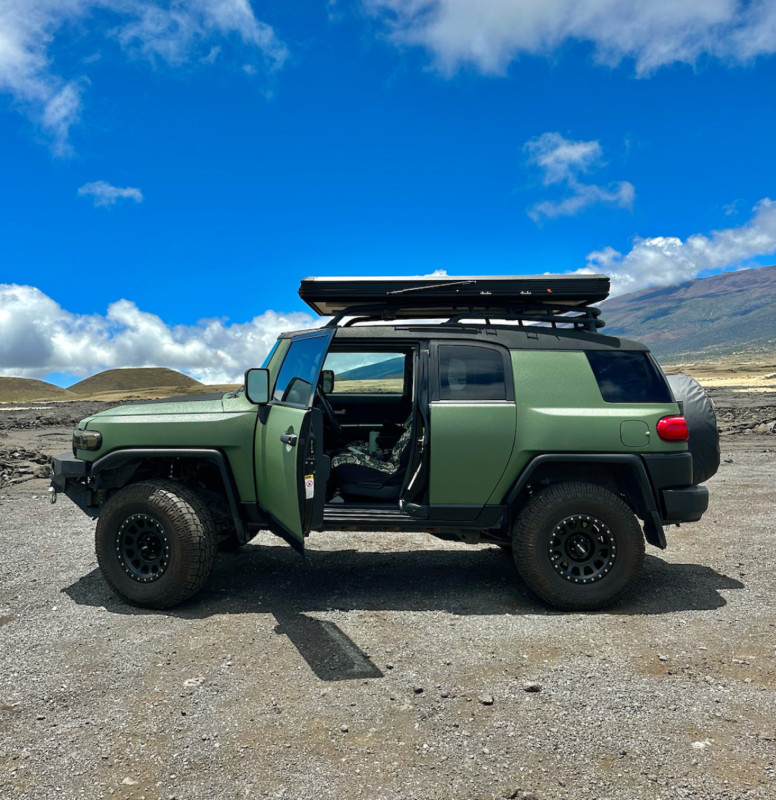 Découvrez Big Island comme jamais auparavant avec notre aventure unique 2-en-1 ! Explorez l'île à bord du seul FJ Cruiser vert mat entièrement équipé, doté d'une transmission intégrale (4x4), d'une suspension surélevée et de roues de 33 pouces. Après votre réservation, vous recevrez notre guide personnalisé contenant les meilleurs spots de camping, restaurants, randonnées et excursions. Voyagez et campez avec style grâce à tout l’équipement nécessaire, y compris une tente rigide sur le toit et un matelas confortable. Réservation réservée aux 21 ans et plus !