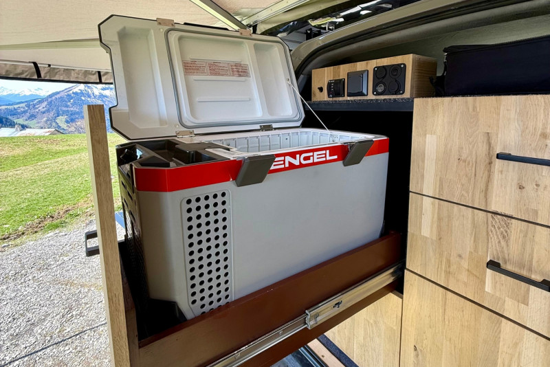 - Cuisine équipée : réchaud 2 feux, frigo 40L, vaisselle, rangements, table et chaises… tout pour cuisiner et manger confortablement.