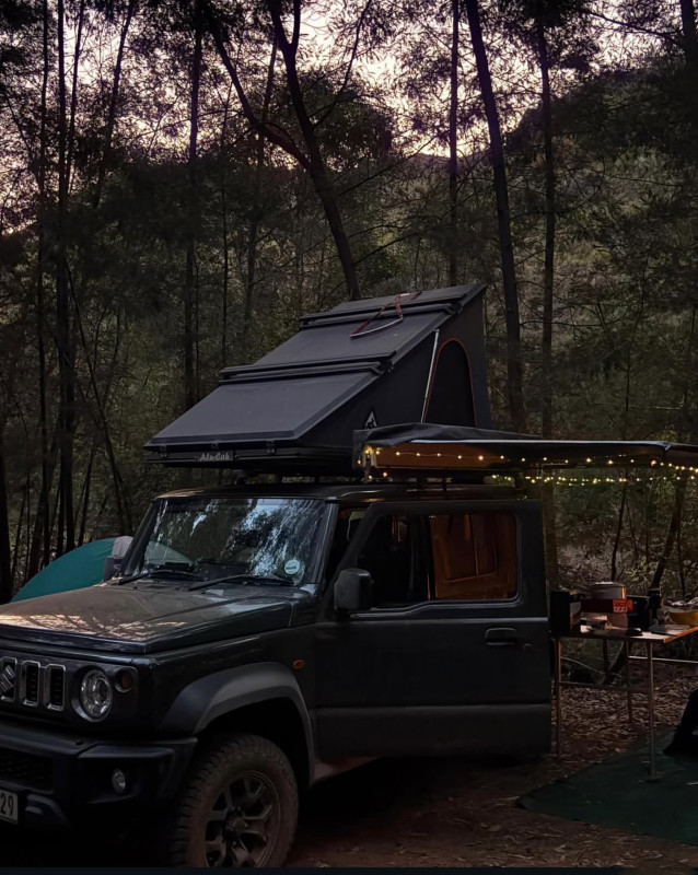 Le Jimny Olive est un petit 4×4 tout-terrain aménagé pour accueillir 2 personnes dans une configuration « camping + aventure ».