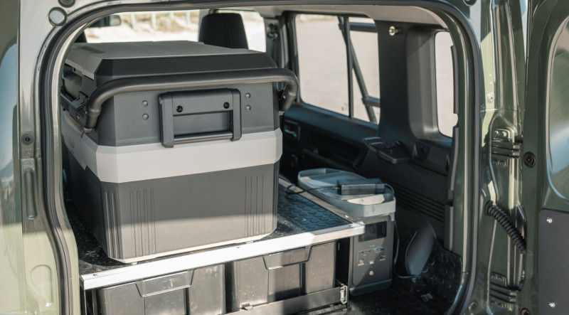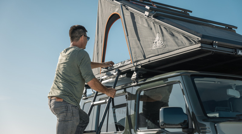 Totalement équipé pour le camping : une tente de toit avec literie, une cuisine entièrement équipée, un auvent 270° de type Alu-Cab pour s’abriter, une table et deux chaises de camp, un réservoir d’eau de 50 L, un réchaud à gaz, des toiles de sol (ground sheets), du matériel de secours (recovery gear), une trousse de premiers secours et une roue de secours.