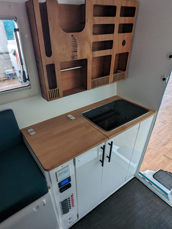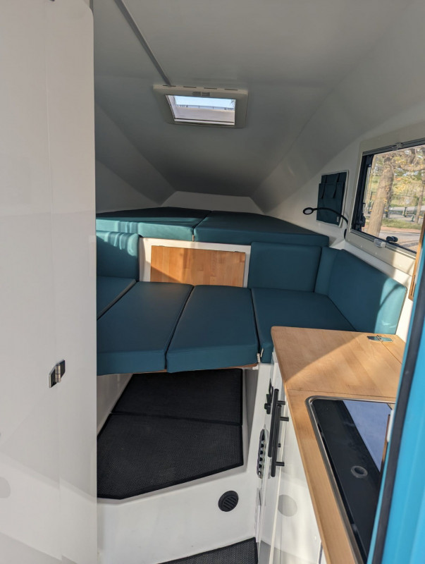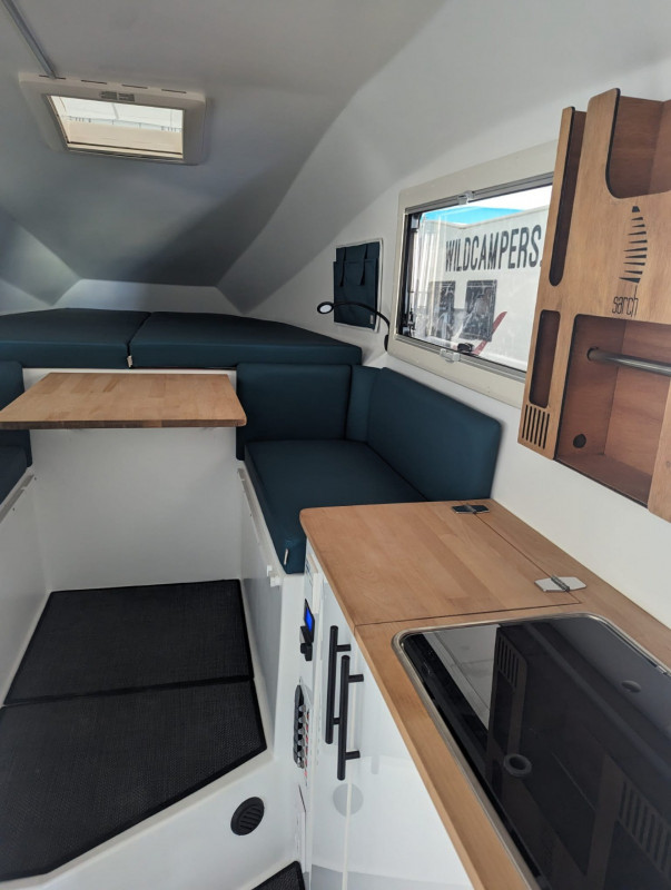 Équipement complet pour le bivouac : autonomie électrique, eau, cuisine, douchette… tout est prêt pour votre road trip.