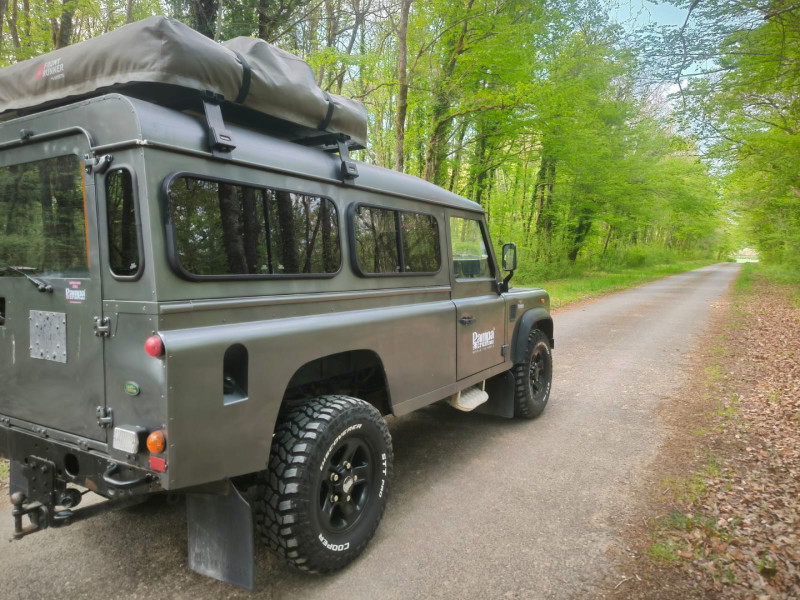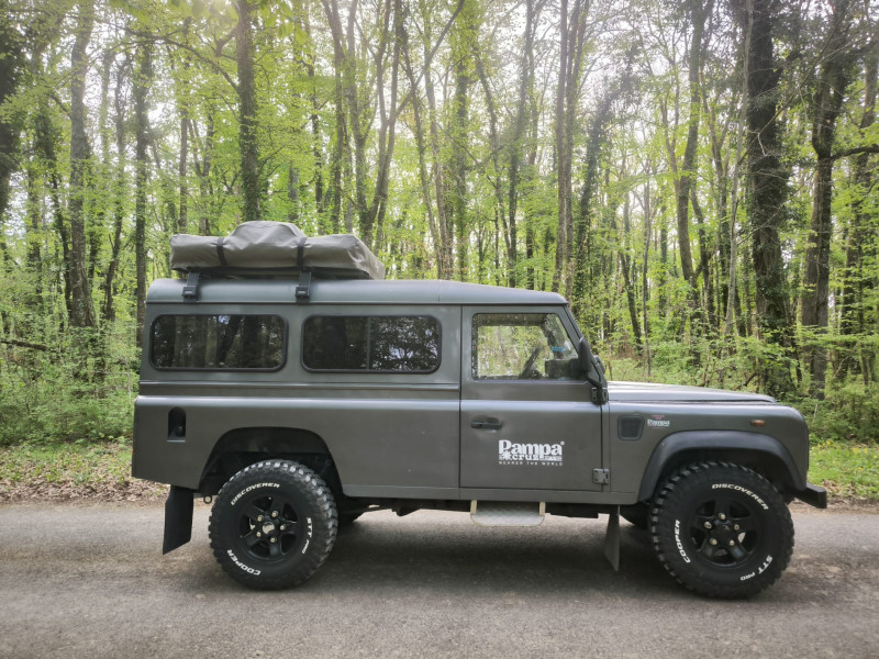Équipé d'une tente de toit Front Runner spacieuse et facile à déployer, ce Defender dispose d’une grande capacité de chargement et de tout le nécessaire pour voyager en autonomie :