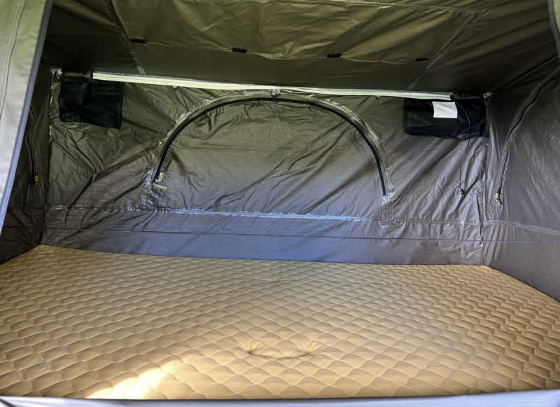 Fiona peut être livrée avec cuisine et glacière si vous le souhaitez. Elle est équipée d'une tente de toit Pathfinder 2 électrique. Appuyez sur la télécommande et le lit est prêt, du moins presque.