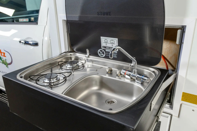 Le véhicule est bien équipé pour le camping : il comprend un réfrigérateur/congélateur de 40 L, une cuisinière à gaz (avec deux foyers – un intérieur et un extérieur) alimentée par une bouteille de gaz de 3 kg, un réservoir d’eau de 60 L, une douche extérieure à main et des installations pour l’eau chaude.