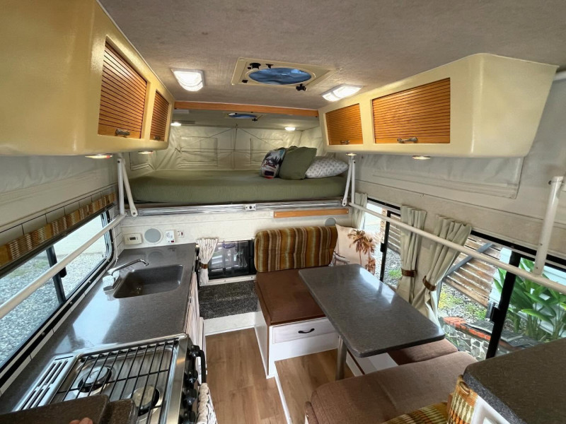 Le Hilux Camper est aménagé pour accueillir jusqu’à 3 voyageurs, avec un lit double et un lit simple, la climatisation, un ventilateur de toit, et plusieurs fenêtres moustiquaires pour des nuits au frais. Les draps et serviettes sont bien sûr inclus — vous n’avez qu’à poser vos valises.