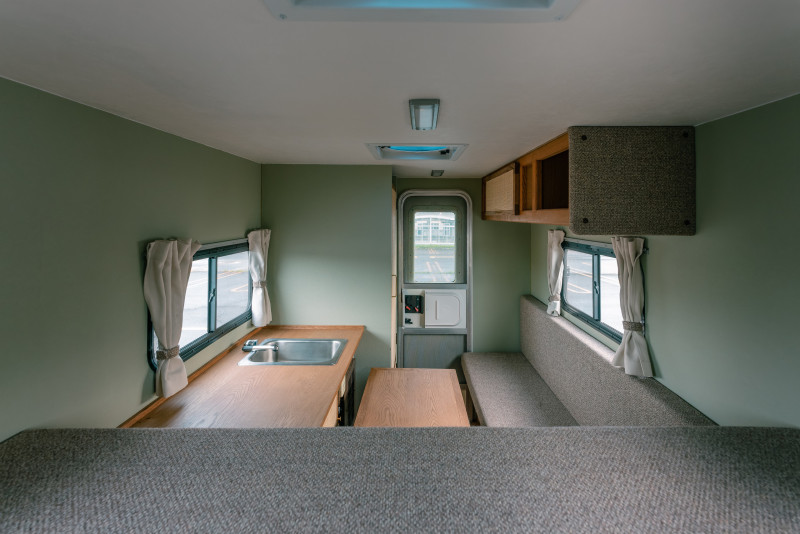 Réchaud, évier et rangements pour cuisiner et organiser vos affaires.