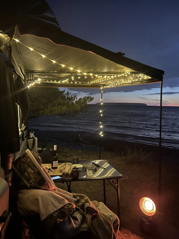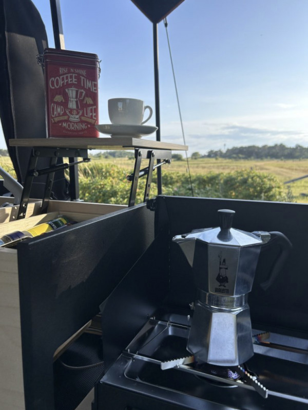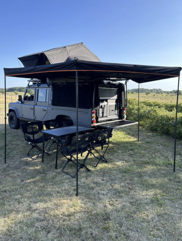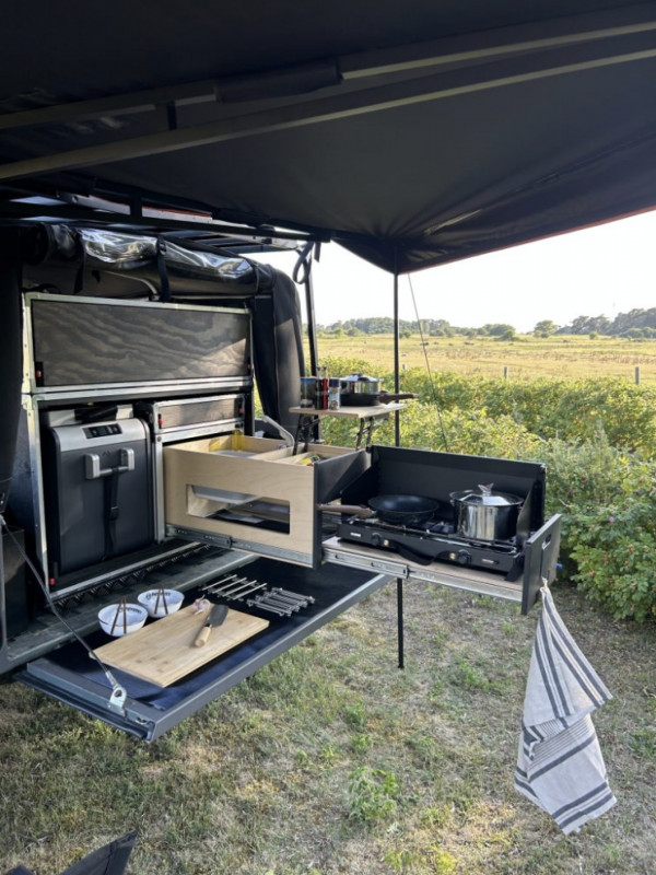 4 chaises, 2 tables, assiettes, couverts, matériel de cuisine, mugs, bouteilles thermos etc. inclus. Peut être adapté au nombre de personnes, standard pour 4 personnes.